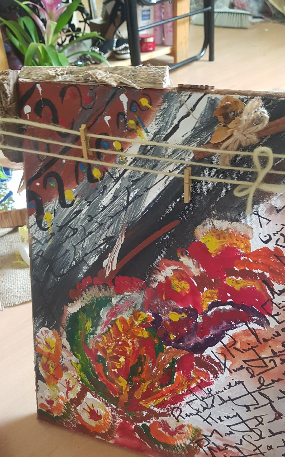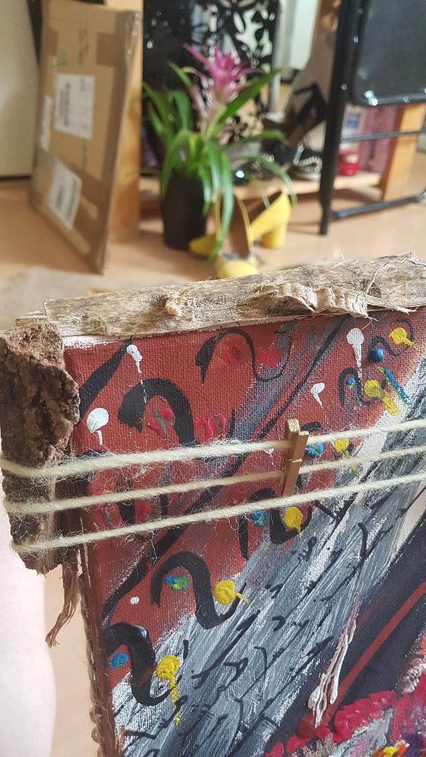 une toile dessinée et peinte à l’acrylique avec une suspension pour bijoux